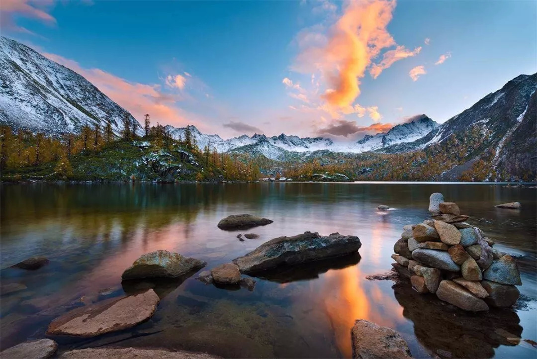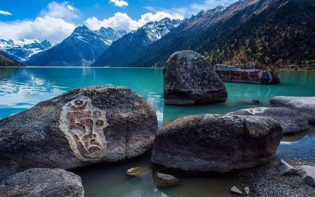 又名玉龙拉错,意思是倾心神湖,新路海是甘孜州著名的冰蚀湖。湖畔的玛尼石堆使它有别于其他湖泊,宁静而吉祥。