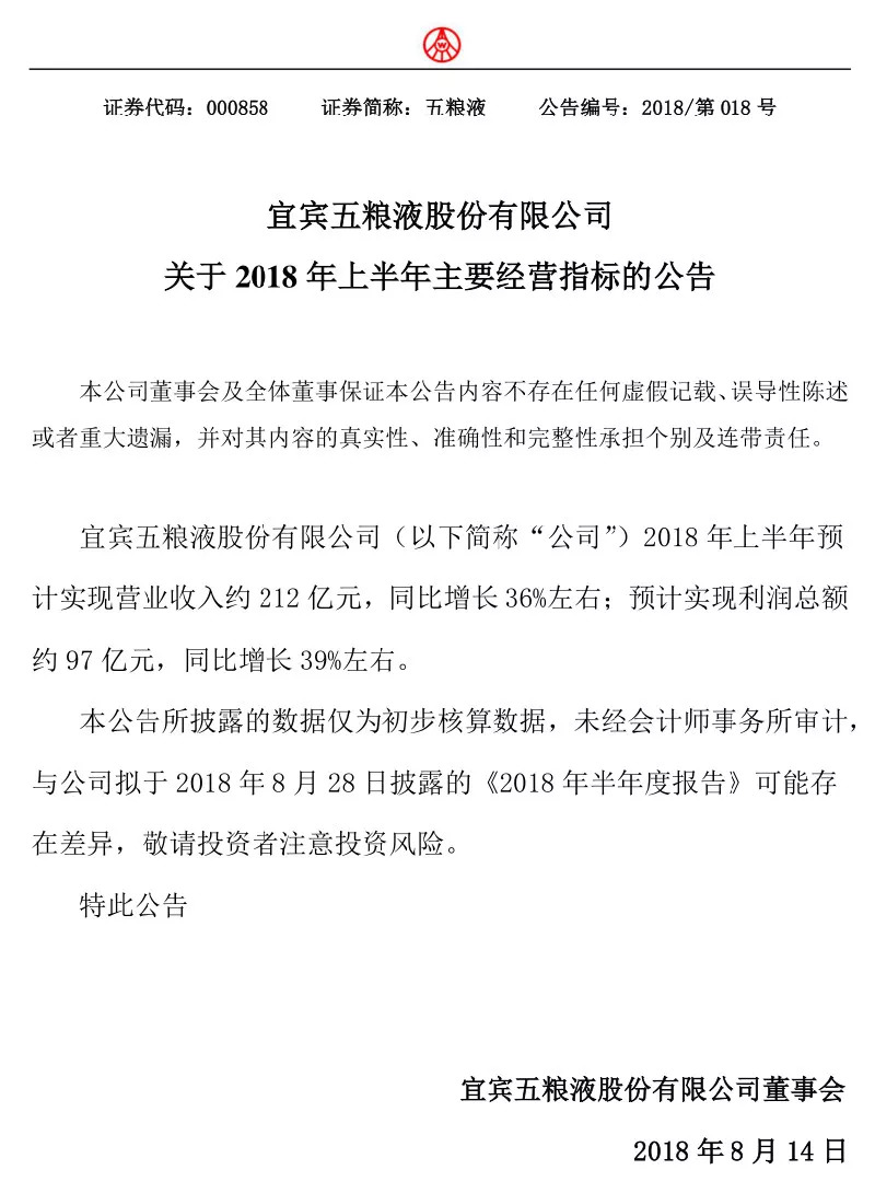 8月13日晚间,五粮液(000858.SZ)发布了2018年上半年主要经营指标的公告,2018年上半年预计实现营业收入约212亿元,同比增长36%左右;预计实现利润总额约97亿元,同比增长39%左右。