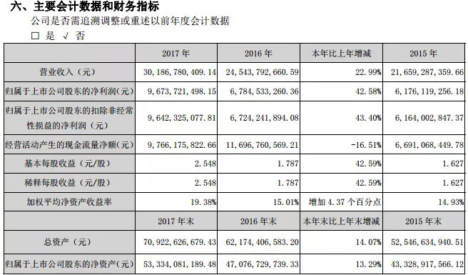 2017年五粮液实现营收301.87亿元,同比增长22.99%;实现净利润96.74亿元,相较于2016年的67.85亿元,增幅为42.58%。