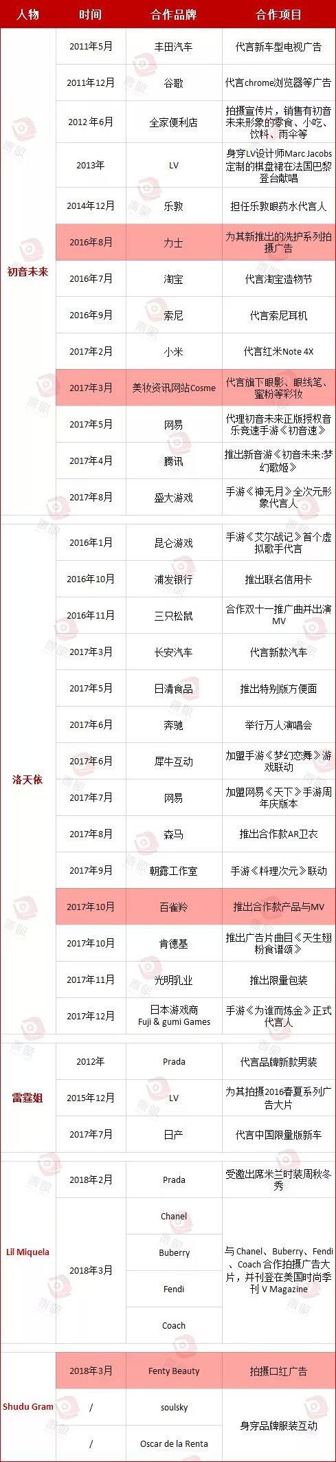 在“负面”新闻极易爆炸传播的社交媒体时代,流量明星的营销风险正在加剧,除了有公众影响力的明星代言人,品牌也开始尝试用网红KOL、二次元虚拟偶像为品牌代言或推广,来分散代言人负面影响的潜在风险。比如,在先后迈过柯震东、薛之谦、鹿晗的坑后,KFC换上了最靠谱的代言人虚拟偶像“洛天依”。