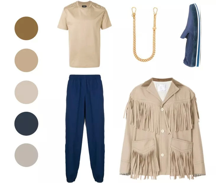 裸色系怎么穿一直都是个问题,尤其是莫兰迪色系中的裸色在实际应用到穿着的时候就很容易看起来平平无奇。所以我们建议加入一点蓝色的元素,让整体的搭配更加鲜活,在配饰的选择上最好选择钨金而不是太过耀眼的黄金,避免让自己看起来很像“暴发户”。