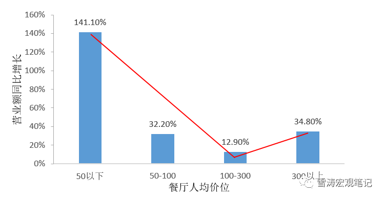 餐饮业的情况也体现出M型的两极化。2018年6月北京最受欢迎的餐厅中,价位在人均50元以下和50-100元的餐厅营业额同比增速高达141%和32.2%,人均价位300元以上的高档餐厅销售增速为34.8%,人均100-300元的中端餐厅营业额增速只有12.9%。