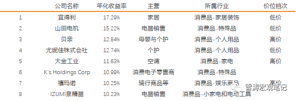 第一类是高性价比的低价平民消费品。1992-2017年,年化涨幅第一的宜得利(NITORI)是日本家居市场的绝对领袖,力求将产品做到“确保质量与功能的同时价格减少1/2”;年化涨幅第二的山田电机(YAMADA)主营家用电器,创业以来始终奉行“以合理价格提供高品质商品”的经营理念;年化涨幅第四的尤妮佳主打产品高性价比的女性生理用品和婴儿纸尿裤,子品牌在中国也非常有名。