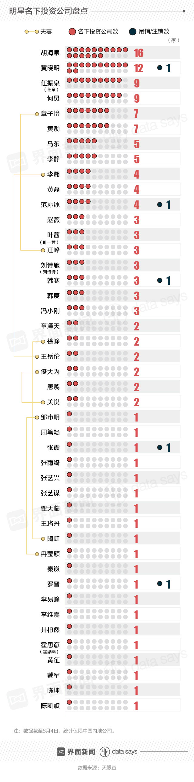 界面数据(公众号ID:tuli_shuju)在梳理出的公司名单中筛选整理“投资”、“资产管理”等字段发现,截至6月4日,胡海泉、黄晓明名下分别拥有16、12家投资公司,任泉、何炅则分别拥有9家。