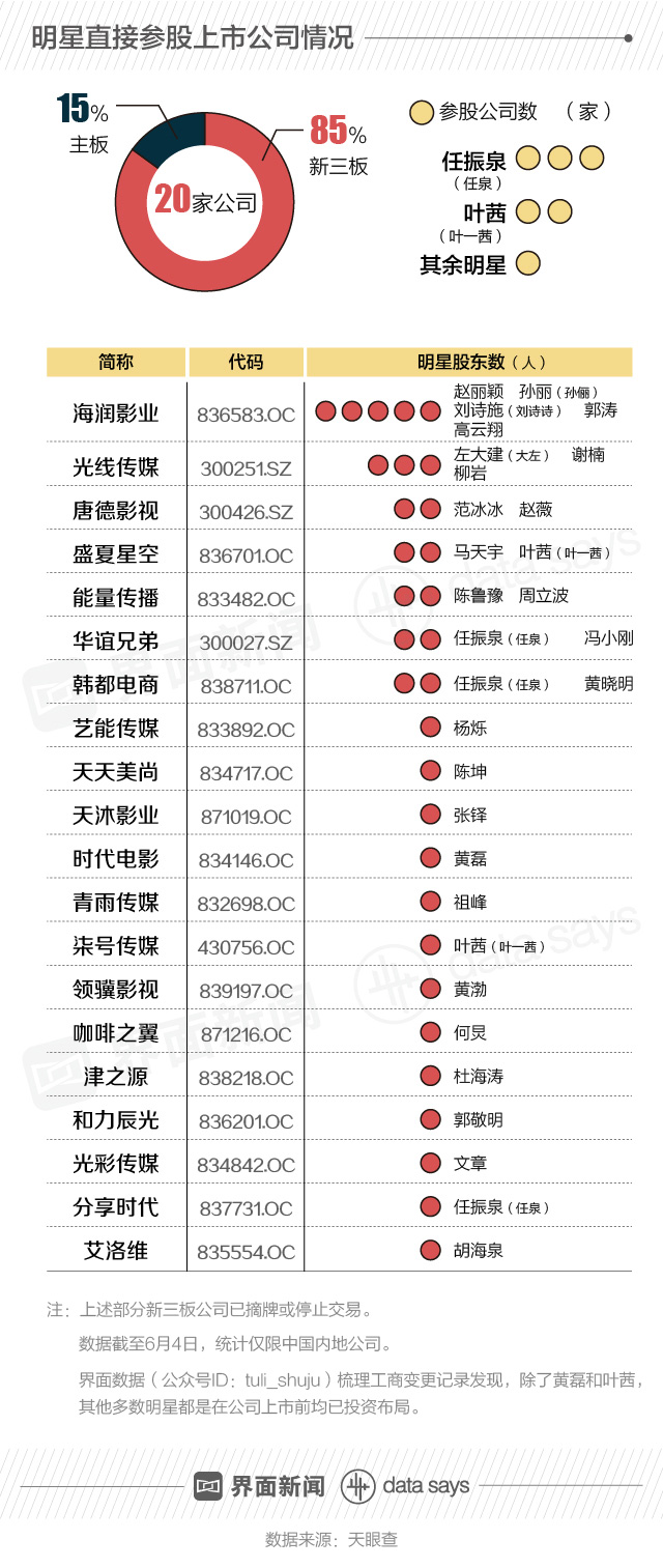 此外,界面数据(公众号ID:tuli_shuju)梳理工商变更记录发现,多数明星都是在公司上市前均已投资布局。