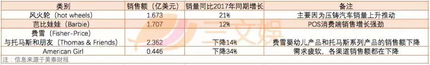 如其玩具盒品牌(包括自由品牌和合作品牌)总销售额在2018年第二季度下降 23% ,至 3.347 亿美元。自有品牌主要受“怪兽高中”( Monster High )和“超级富豪”( MEGA )销量下降影响,股价下跌 10% ,至 1.599 亿美元。而且由于汽车销量下降,合作品牌第二季度的总销售额为 1.747 亿美元( 下降 32% )。
