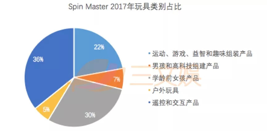 从业务板块上看,Spin Master 目前玩具销售主要分为五大类:运动&游戏&益智和趣味组装产品、遥控和交互产品、男孩运动和高科技组建产品、学龄前女孩产品和户外玩具。