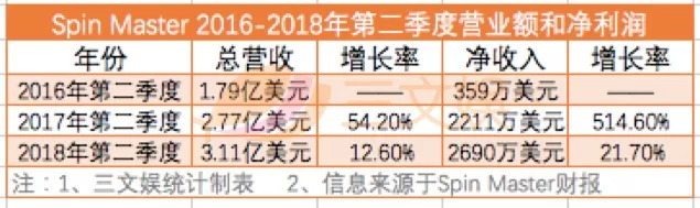 通过比较 2016-2018 年三年第二季度的营业数据可以看出,因大受欢迎的孵化蛋与汪汪特工队,Spin Master 2017 年度总营收增长速率超过 50% ,净收入增长率更是达到了 514% 。2018 年第二季度增长速度相对放缓,总营收达到 3.11 亿美元,同比增长12.6%,净收入 2690 万美元,同比增长 21.70% 。 Spin Master 将增长主要归功于产品高毛利和通过侵权诉讼成功得到的补偿。