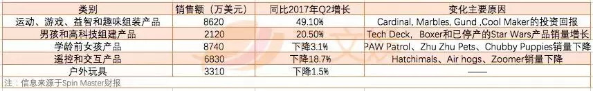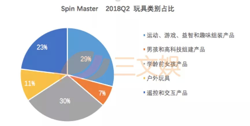 其 2018 年 Q2 业务结构与以往相比发生了较大改变。三文娱在之前文章《半年利润翻 6 倍,这家公司靠孵蛋玩具和萌犬动画等年收入 11.5 亿美元,市值追赶三大玩具公司》中分析得出,Spin Master2017 年营收额增势强劲得益于哈驰魔法孵化蛋(Hatchimals)系列和萌犬动画汪汪队立大功(PAW protrol)系列热卖。但在 2018 年 Q2 财报中可以看出,这些爆款在热度退散后,销售额在下降,导致相应业务销售额下滑。