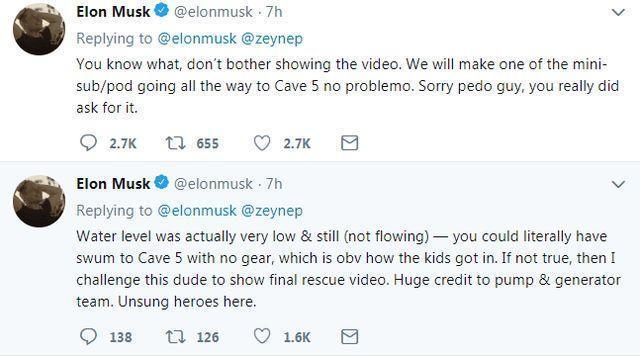 7月份,世界各地迎来暴雨天气,到处都是洪涝灾害。其中一支泰国少年足球队被困熔岩山洞的消息,牵动着世界人民的心。然后马斯克就带着团队设计了一款小型潜艇,准备参与营救。到这里,事情还是朝着献爱心方向发展。但潜艇运到泰国之后,处于一线的营救团队直接淘汰了这一方案,还嫌马斯克蹭热点的姿态难看。然后马斯克的玻璃心的受不住直接发飙了,直接在Twitter上骂救援队的一名队长是“恋童癖”。一句话闹得沸沸扬扬,为特斯拉招来了不少负面。