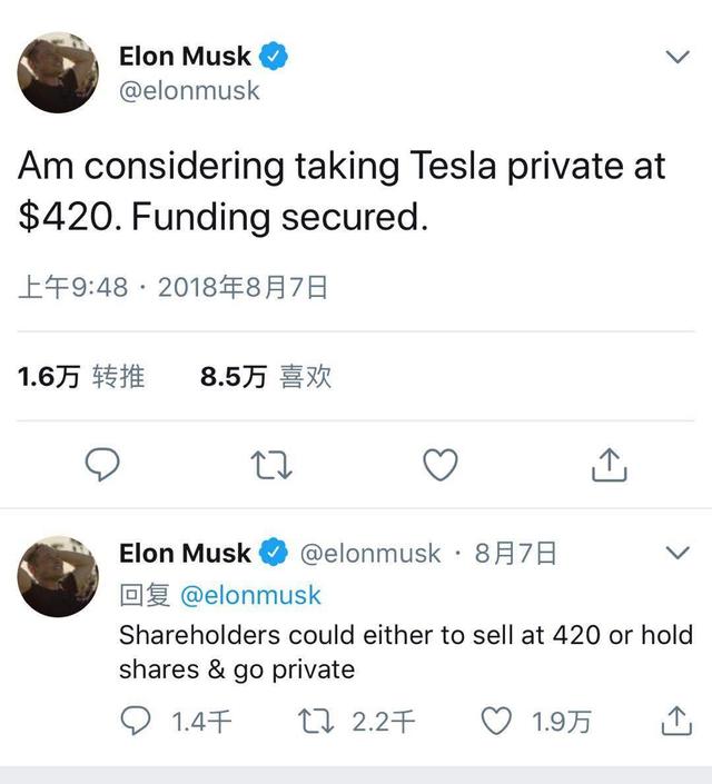 等美国证券交易监督委员会(SEC)发来问询函,已经是一周以后的事情,而且特斯拉的股价也只是略有下跌。华尔街到今天也没有任何一家公司跳出来,表示自己接下了特斯拉私有化的业务,马斯克口中的私有化大戏现在也仅仅停留在口头上而已。