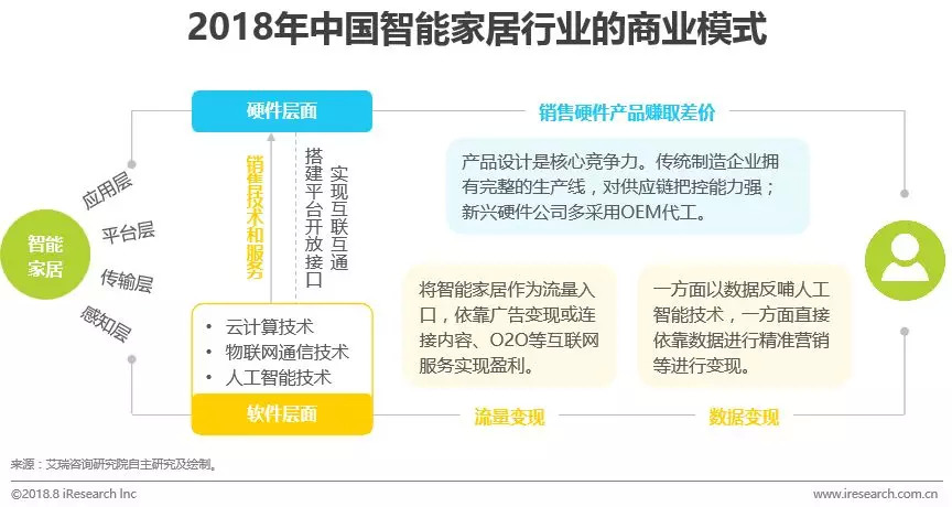 将智能家居划分为硬件和软件两个层面,其中硬件对应于智能家居的应用层,软件对于智能家居的平台层、传输层和感知层。硬件产品的品牌方专注于产品侧的设计和制造,向终端用户提供的是智能家居的物理属性,通过销售硬件赚取差价实现盈利。针对智能家用产品的云计算、物联网通信和人工智能三项核心技术,技术供应商通常会提供其中的一项或多项能力。他们既可以选择直接通过向硬件厂商销售技术和服务变现,也可以选择以硬件产品连接到海量的终端用户,利用获取到的用户流量和数据,通过面向消费者的互联网服务和面向企业的数据服务进行变现。