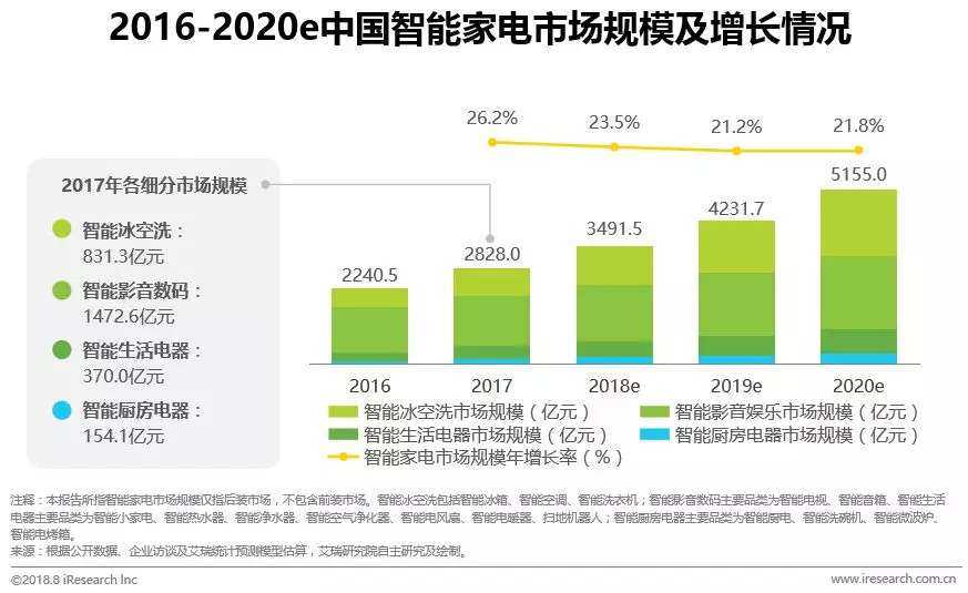 在2017年2828.0亿元的智能家电市场中,智能冰箱、空调、洗衣机市场规模为831.3亿元,智能影音数码(智能电视、智能音箱等)市场规模为1472.6亿元。考虑到智能电视渗透率的增长空间已经比较有限,而冰空洗等白电产品的智能化渗透率逐年上升,中国智能家电市场将保持稳定增长,预计到2020年市场规模将达到5155.0亿元。