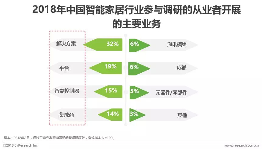 参与调研的从业者所在企业的业务布局占比最多的是解决方案(32%),其次分别是平台(19%)、智能控制器(15%)、集成商(14%),艾瑞认为:目前行业内,无论是厂商自有技术还是与第三方合作,主流业务聚焦在辅助传统家电、家居业务线智能改造以及功能升级;值得关注的是,行业内主流玩家都比较倾向于搭建平台,不仅是便于自有产品的横向布局,还寄望于以自身企业为中心的生态链纵向发展。