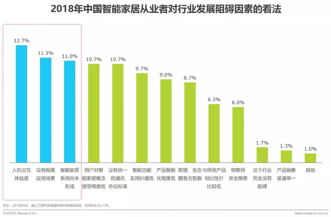 截止2018年上半年,智能家居的发展并没有预测中火爆,受访者认为排在第一梯队最主要的阻碍原因——分别来自于产品、用户、技术三个维度;首当其冲的是目前市面上的产品,人机交互体验差(12.7%);其次,从业者认为,现有还没真正挖掘用户的刚需应用场景(11.3%);第三位则是全屋智能家居系统尚未形成(11.0%),产品之间无法互联互通,缺乏联动性。艾瑞认为,不管是从用户需求、产品研发,还是市场布局的角度,业内停留在“为了智能而智能”的阶段进步微小,这样的出发点,最终会导致用户并不愿意为非需求功能提升而产生的产品溢价埋单,最终导致的市场的不良闭环。