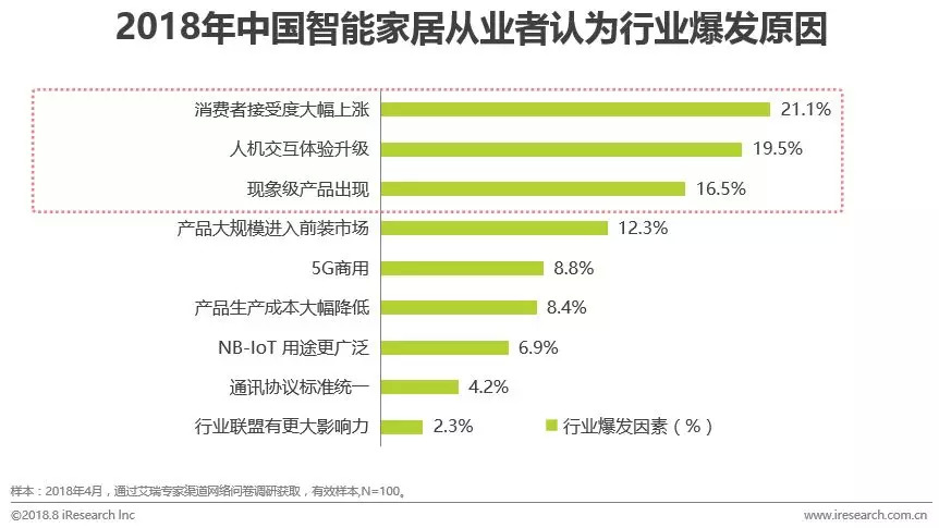 44%的从业者认为距离智能家居行业爆发还有两年,从业者判断的依据是,从市场教育的角度来看,消费者经过行业初期的市场教育,对于智能家居产品的接受度大幅上涨(21.1%);从用户体验的角度来看,历经2018-2020年的技术磨炼与产品迭代,人机交互的体验将有所提升(19.5%);市场关注度的角度来看,一款现象级产品的出现(16.5%),将会引领更多的关注目光,更有利于提升市场对产品的需求,以及使得资本运作持续升温,这些对于行业爆发都是关键性因素。