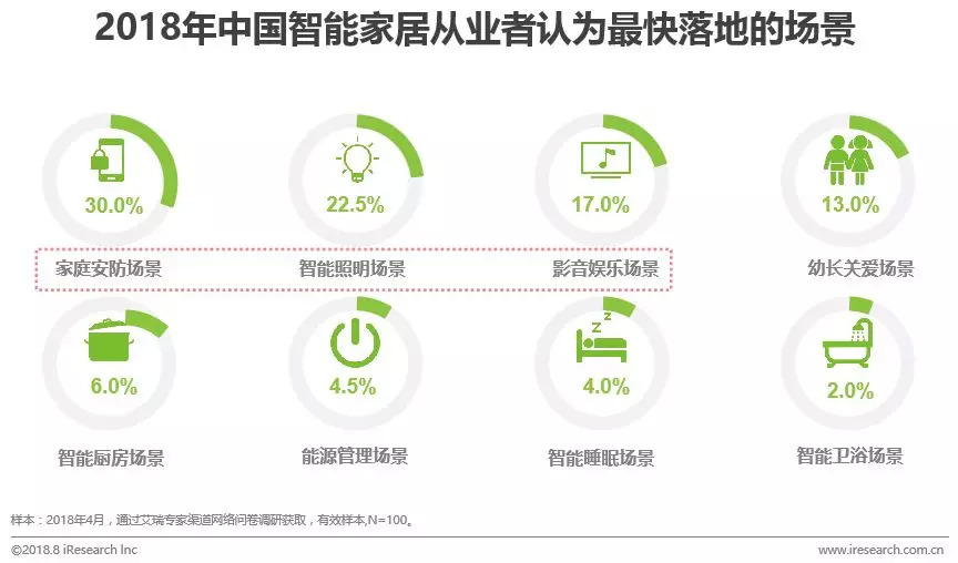 基于自身专业角度和对行业用户的认知来判断,从业者认为以家为消费单位的用户,最关注的是家庭安全问题,尤其是租房市场上,租户和房东都特别关注房屋与人身安全,家庭安防场景(30.0%)被认为是刚需场景;其次,从业者认为用户由于照明场景(22.5%)的智能灯泡的进入壁垒低(替换成本低且容易实施),因此认为该场景落地难度不高;第三,影音娱乐场景(17.0%)也比较被看好,原因是在家庭生活里,该场景满足了用户在生活当中的休闲、放松和娱乐需求。艾瑞认为:场景的发展有两个方向:一方面,需求高的场景产品,市场表现也相对活跃,厂商也愿意投入资源加快产品迭代;另一方面,作为试水型场景,虽然智能程度低,但由于置换成本低容易被消费者接受,起到教育市场的作用。