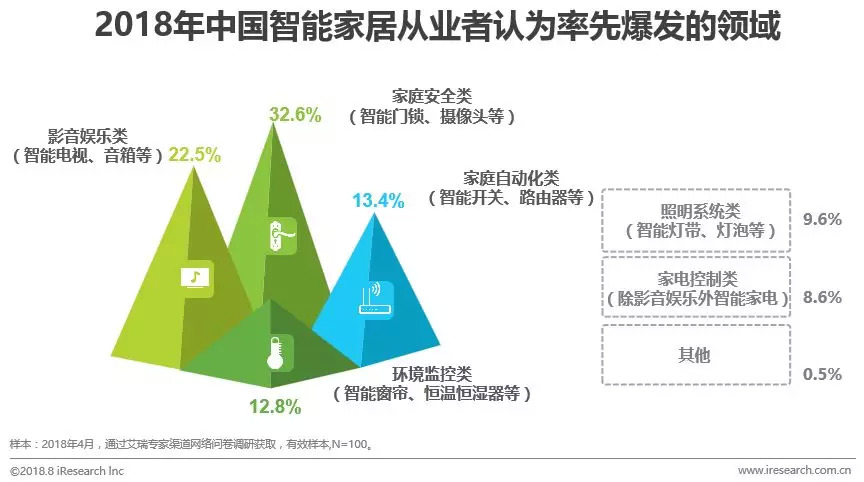 基于自身专业角度、综合技术情况来判断,从业者认为在人脸识别、智能视频分析、前端计算能力等技术的引领下,家庭安防类产品(32.6%)将会是爆发的最先领域;其次,从业者认为影音娱乐类产品(22.5%)也非常具有爆发的潜力,原因是各互联网巨头纷纷加入智能电视与智能音箱的战局,激烈的行业竞争,将有效推动产品迭代以及功能升级;第三,家庭自动化类产品(13.4%),目前,市面上的全屋类自动化对基础设施布控有一定要求,因此,未来在不需要升级基础布控下,实现全屋自动化的产品值得期待。