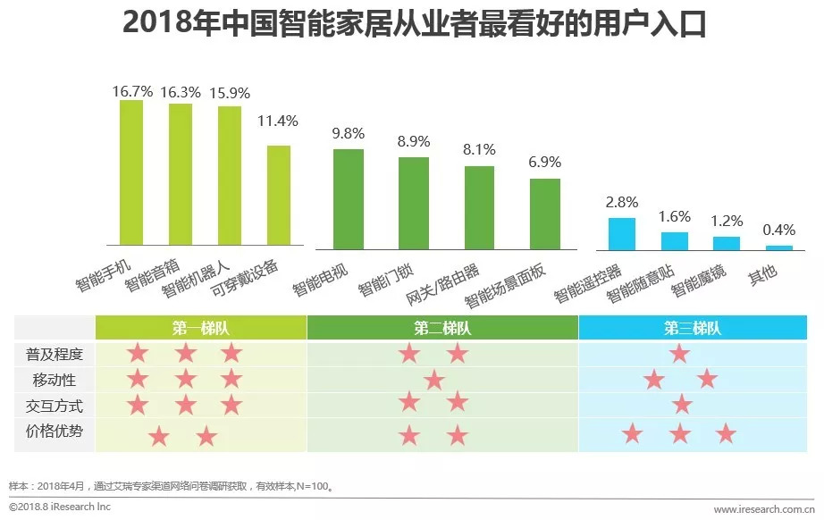 从传统家电升级为智能家居时,背后的信息源越来越多且信息体量越来越大,因此,最好的解决方法是创造一个集中信息流的入口产品,将家居内所有的用户数据都统一起来,通过学习与判断用户需求和习惯,达到“千人千面”的服务效果。从看好的用户入口产品梯队来看,第一梯队的产品具有三个特征:移动性强、交互功能易上手但价格稍高;智能手机排在第一位,很大程度是因为智能手机的普及率高且 APP 控制方式易于掌握;紧随其后的是在智能语音技术和泛声音娱乐内容加持下的智能音箱,从业者普遍认为这是国内外各大巨头抢占的用户入口产品。