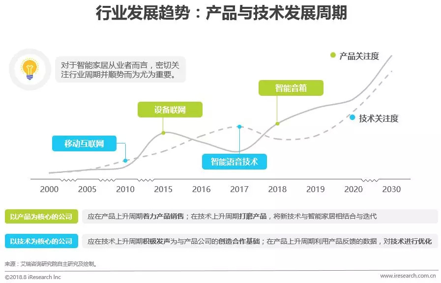 2017年中国智能家居市场规模为3254.7亿元,预计未来三年内市场将保持21.4%的年复合增长率。无论是垂直领域的独角兽,或是互联网、硬件、家电领域的行业巨头,都希望从中分一杯羹,而两者之间看似针锋相对,实则相互依存。在产品与技术周期相互交替的发展规律下,顺势而为才能把握市场机遇。