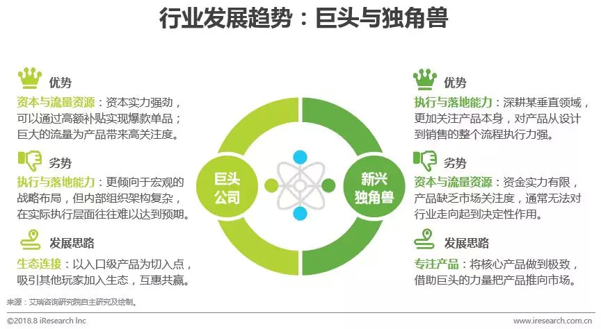 艾瑞认为:无论垂直领域的独角兽企业,或是互联网、硬件、家电领域的巨头公司,都希望从智能家居市场中分一杯羹。出于行业广度和深度的考虑,在看似针锋相对的竞争关系背后,未来巨头和独角兽之间应当是相互依存的。原因是巨头公司倾向于从宏观层面提出战略布局,着眼于整个智能家居市场而非某个单品。