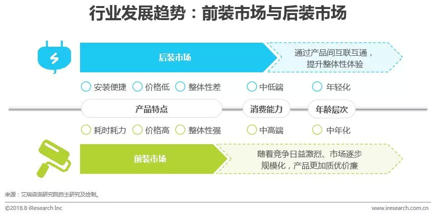 艾瑞认为:无线对有线的替代是现阶段智能家居的重要特点,安装便捷且价格更低让后装智能家居先于前装走入消费者的视野。但后装智能家居更偏向DIY,属于由多个智能单品组合而成的系统,因为,没有从整体对智能家居进行统一布局,用户体验与前装智能家居相去甚远。在智能家居的受众由极客向大众过渡的过程中,前装市场将会发挥出重要的作用。部分智能家居厂商已经开始与房地产、家装公司合作,将其产品打包进整体的智能家居解决方案,一方面借助线下渠道的力量更快的触达消费者,一方面将目标用户拓展至消费能力更强、年龄层次更广的群体中。但是,考虑到前装与后装适用于不同的场景,两者之间存在一定的优势互补,未来势必会齐头并进,共同促进智能家居行业的发展。