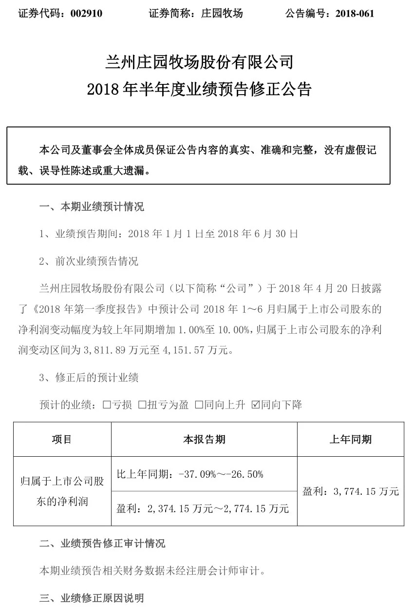 8月13日晚间,庄园牧场(002910.SZ)披露上半年度业绩预告修正公告,将此前预计上半年归属于上市公司股东的净利润为预增修正为预减。