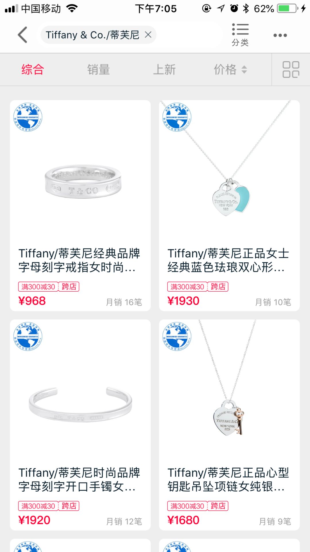 比如天猫里就算你不开品牌旗舰店,消费者也可以买得到你家的东西,前文提到如果你在天猫里不输入luxury pavilion,而输入“Tiffany蒂芙尼旗舰”字样,你当然不会看到luxury pavilion里的花韵系列,你会看到一屏幕的价格不超过4000块的Tiffany银饰,而你此刻已经身处一个名为“王府井百货官方旗舰店”的地方,或者你想货比三家,可以继续在天猫里搜索“tiffany手链”,那么你有可能进入“**海外专营店”,她和luxury pavilion没关系,这叫“天猫国际”,属于跨境电商。