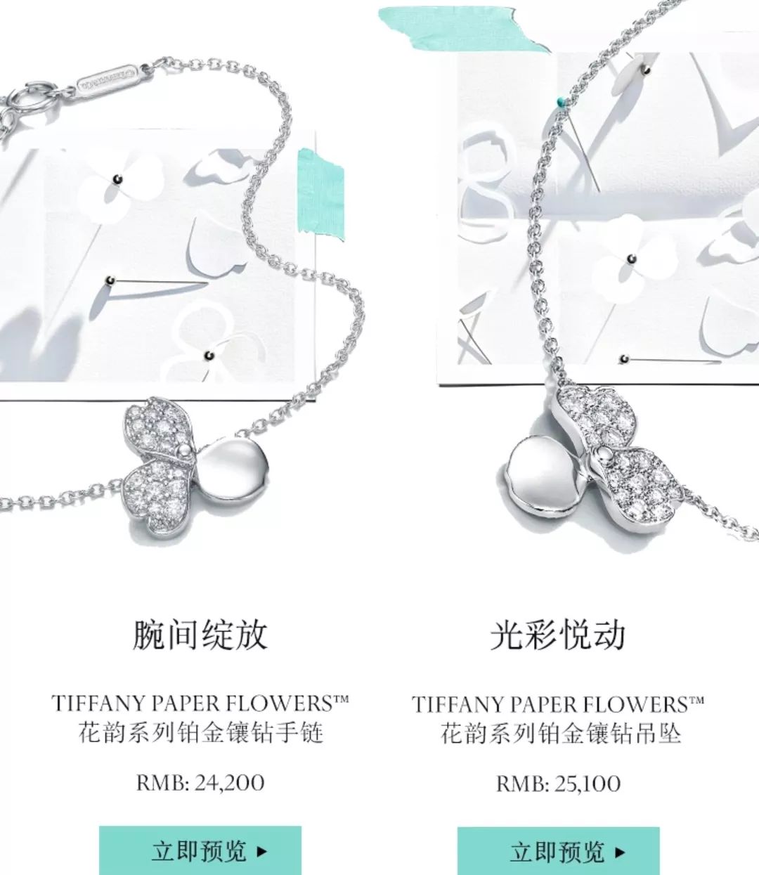 产品价格区间更宽泛。Tiffany这次在快闪店当中呈现作品价格带非常宽泛,最高67,3000,最低22,400,中间有103,000,81,000,31,400,25,100和24,200,总共7个价格区间,所以我们很容易读懂两个初相识的恋人间的微妙心理:试探。嗯,Tiffany想用价格区间的设置看看天猫上消费者的选择偏好,这说明,品牌不是一蹴而就的选择,他们有清楚的目的和步骤,值得肯定。
