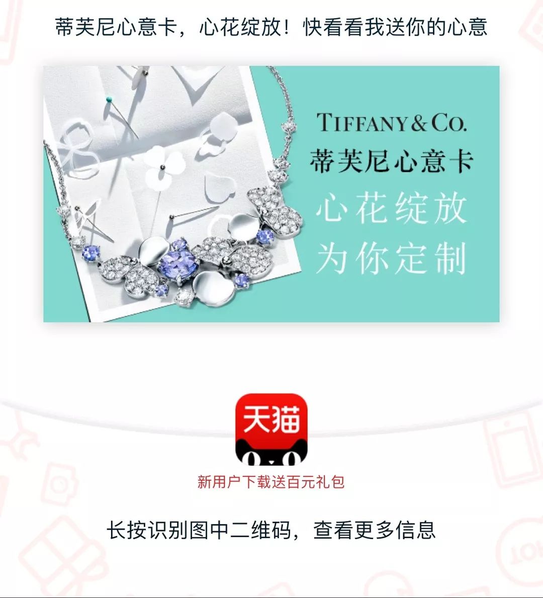 社交属性更凸现。相较于腾讯生态下的微信平台,天猫的社交属性一直是软肋,但我们无法求全责备,何况天猫也有自知之明,你看这一次在和Tiffany的合作中,就设计了具有社交分享属性的功能,即你可以制作一张线上的”蒂芙尼心意卡“,然后通过其它平台与朋友们分享,虽然这和更快捷更多样化的微信社交分享功能相比略逊一筹,但还是那句话,敢于尝试就值得鼓励。