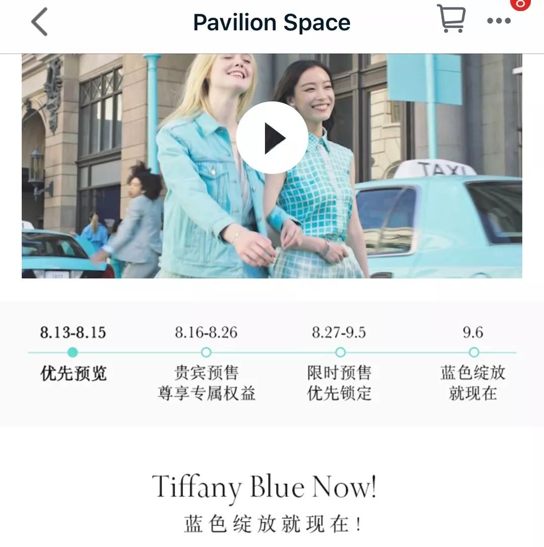 预览到预售的流程更清晰。Tiffany从8月13日在天猫上线快闪店开始一直到9月6日的25天里,设置了4个时间节点和步骤:先是8.13-8.15的“优先预览”,然后8.16到8.26“贵宾预售,尊享专属权益”,接着8.27-9.5是“限时预售,优先预定”,最后是9.6“蓝色绽放”。