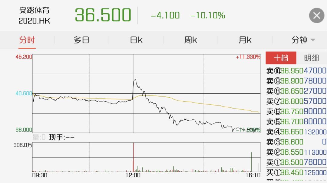 安踏是午间发布的中期报告,此时正值港股午间停牌。在今天上午,随着市场行情不景气,安踏股票窄幅震荡,跌幅处于3%之内,午间收盘跌1.85%;但随着报告发布,在下午1点港股重新开盘时,安踏股价直线大幅拉升,涨幅一度突破4%,但随后,安踏股价持续跳水,截止收盘,安踏大跌10.10%。