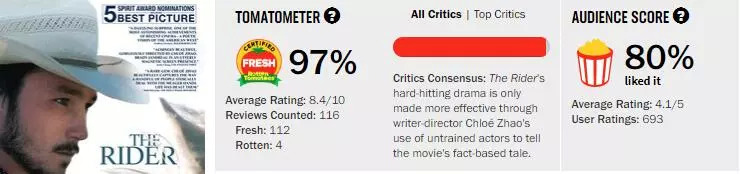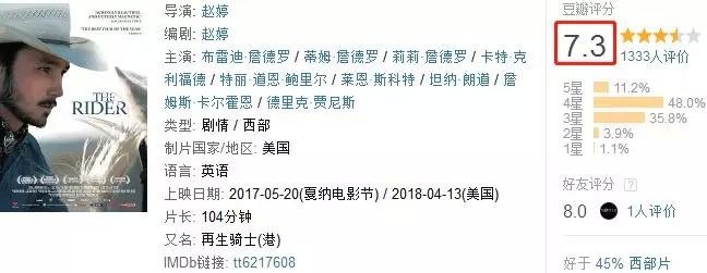 作为一部中国人拍摄的美国本土剧情片,还是许多女性大导都不敢轻易涉足的西部片,就口碑来讲,《骑士》可以称得上是交口称赞。