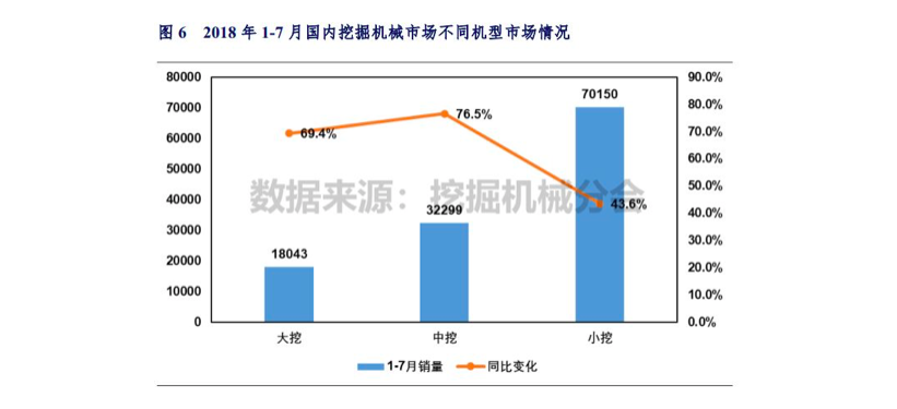 从不同规格产品销量变化看,大挖、中挖和小挖销量同比增加7391、1.4万和2.13万台,涨幅分别为69.4%、76.5%和43.6%。