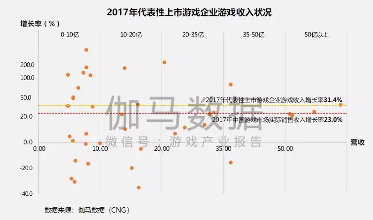 《2018上市游戏企业竞争力报告》还整理了目前游戏业务年收入超过4亿的游戏企业共38家,通过对这些代表性上市企业的整体分析了解上市游戏企业发展状况。伽马数据指出,2017年代表性上市游戏企业游戏收入增长率达到31.4%,这也高出2017年中国游戏市场实际销售收入增长率,显示出上市游戏企业依然是中国游戏产业增长的主要动力。