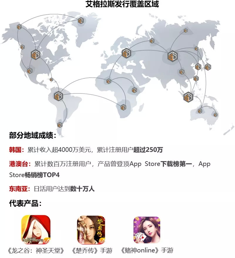 2017年艾格拉斯营业收入达到8.5亿元(包括部分其他业务收入),主要源于艾格拉斯坚持自研并拥有自有推广渠道的策略。艾格拉斯研发了《英雄战魂》系列、《空城计》等多款产品,涵盖了MMOARPG、卡牌、竞技、战略等多个领域。艾格拉斯是国内最早出海的移动游戏企业之一,从2012年推出《英雄战魂Online》即开始深耕海外市场,通过不断摸索找到了更适合和有效率的方式。目前,艾格拉斯旗下产品已发行至全球40多个国家及地区,拥有数千万来自境外区域的用户。