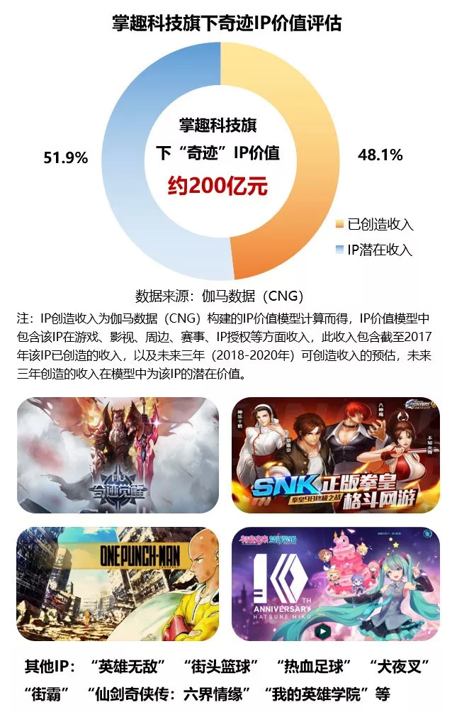 2017年掌趣科技营收达到17.7亿元,2018年营收维持稳定。据掌趣科技2018年半年度业绩预告,预计上半年实现归属上市公司净利润3.5亿元至4.3亿元,相较去年同期增长31.03%~60.98%,净利润大幅上升。增长动力主要是因为其2018年自研新品《奇迹MU:觉醒》《大掌门2》在国内游戏市场表现出色,同时,《奇迹MU:觉醒》已陆续在海外各地区上线,收入还有望持续增长。除了卡牌与MMORPG产品积累优势外,掌趣科技还在向音舞类、体育竞技类等多个品类探索,借此拓展市场空间。未来,掌趣科技坚持自主研发,聚焦侧重技术革新和画面表现的领导型产品、具备特定IP或美术风格的细分型产品以及定位新兴市场突破的流量型产品,立足于IP战略与全球化市场拓展,构建自身竞争力。