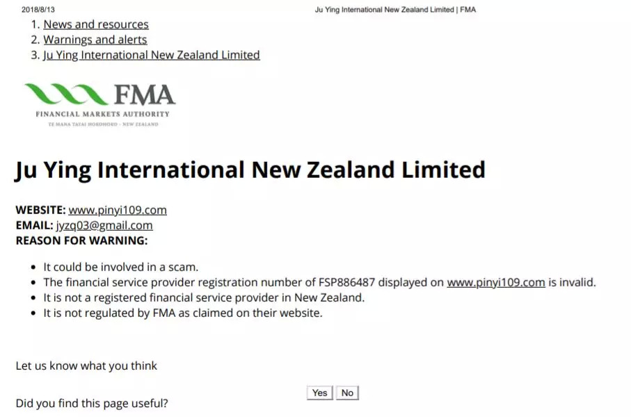 鉴于此,FMA声明,Ju Ying International(聚赢国际)不是新西兰注册金融服务提供商,也不受FMA监管。