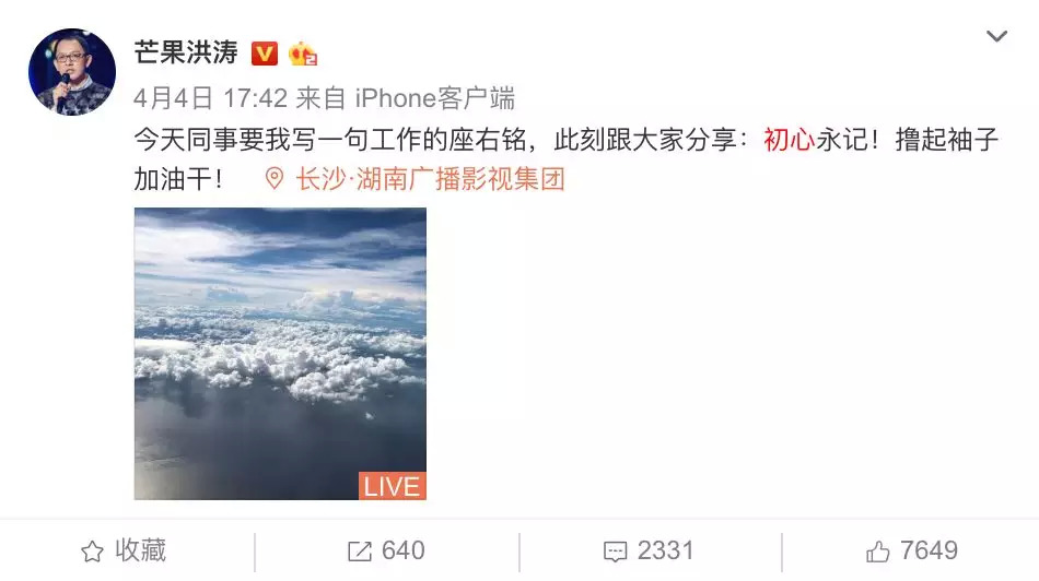 不过,洪涛在湖南卫视的故事显然还没有结束。4月4日,洪涛在微博上表示:“初心永记!撸起袖子加油干!”此条信息定位在了长沙湖南广播影视集团,疑似在回应种种离职传闻。洪涛离开湖南卫视的传言,也最终止于《幻乐之城》的定档。