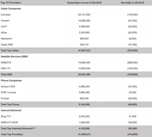 传统的付费电视服务(不包括互联网服务)在2018年第二季度损失了约80万用户,而2017年第二季度则减少了约930,000户。