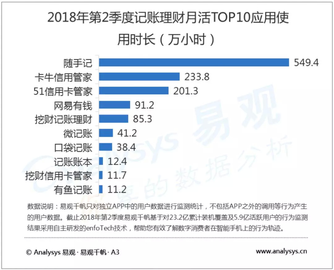 使用时长方面,随手记以549.4万小时排名第一,51信用卡管家和卡牛信用管家分别以233.8和201.3万小时排名第二、三位。