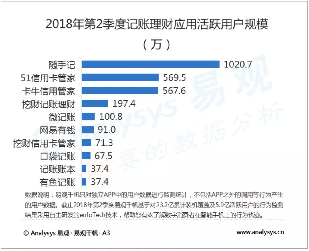 在记账类应用中,随手记以1020.7万活跃用户居行业第一,51信用卡管家和卡牛信用管家分别以569万、567万活跃用户规模位列行业二、三位,卡牛信用管家本季度活跃用户规模增幅较大,与51信用卡管家的规模差距明显缩小。