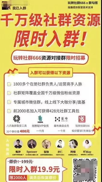 限时、限量:案例中的限时入群,限量2000人,如果你不抢,你就会有失去感。这个之前在电商中已经被玩烂了,但是裂变中用起来,效果也是出奇的好。