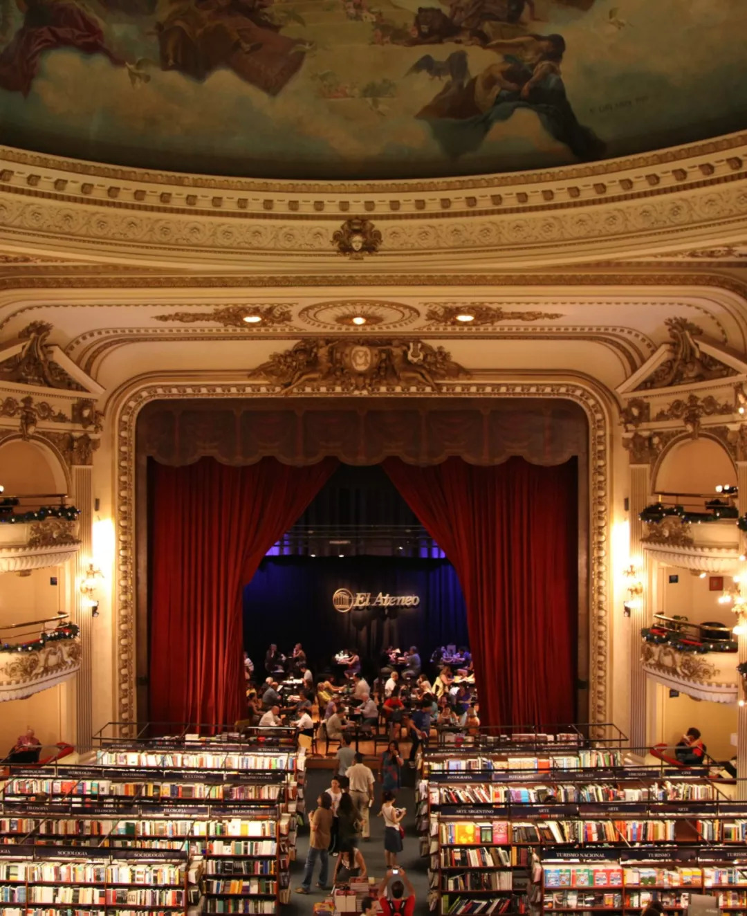 雅典人书店是阿根廷的标志性建筑,始建于1919年,当时的名字是Teatro Grand Splendid大剧院。穹顶壁画、希腊女像柱、腥红色的舞台幕布,书店依然保留着当初的雄伟壮观,书籍与爱书客们,每日都在这里循环上演着新的剧目。