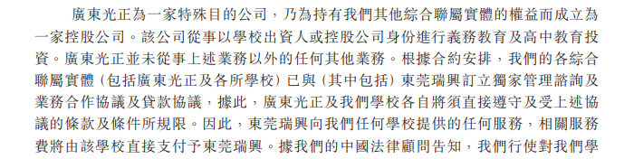 睿见教育(06068.HK)招股书显示,公司通过“光正教育”全资拥有三家外商独资公司。通过合同,外商独资公司成为6家中小学的独家管理咨询服务商,学校向公司支付服务费用。由于VIE架构可以合并学校实体的财务报表,此类上市公司的营收、利润数据仍显示为学校的经营收入,“服务费”变利润的操作并不显眼。