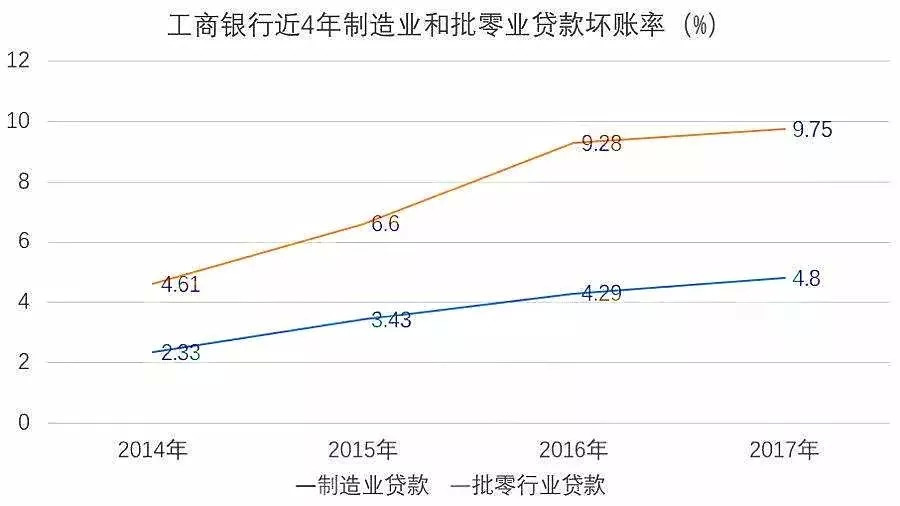 ▲工商银行制造业和批零业贷款坏账率。(小微企业多集中于制造业和批零业领域)