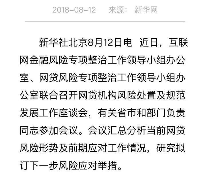 8月12日,两个小组办公室召开座谈会,提出10大风险应对举措,其中包括严禁新增网贷机构,缉捕外逃人员,全力做好追赃挽损,加大力度惩戒恶意逃废债行为。会议指出,做好网贷风险专项整治是防范化解重大风险攻坚战的重要战役。
