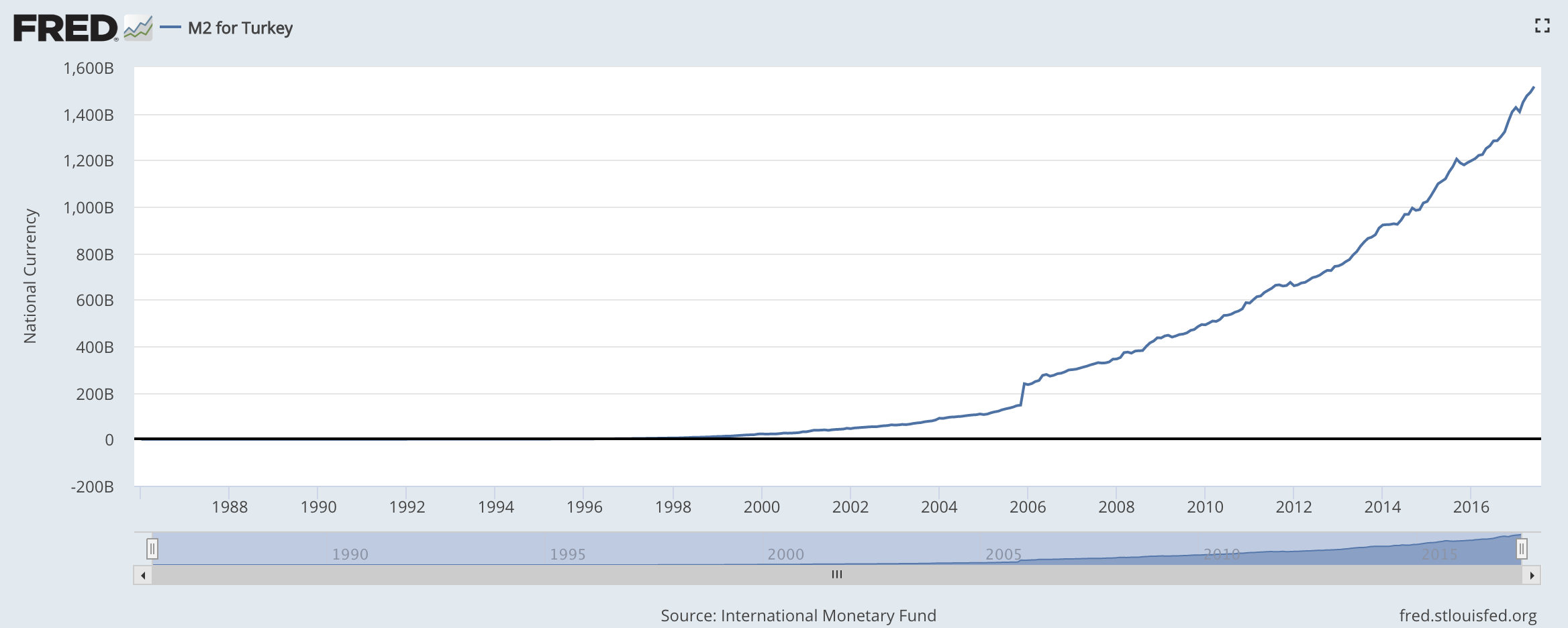 除了借外债,埃尔多安更是大开印钱放水的闸门。从2003年至今,土耳其的广义货币(M2)整整增加了24倍,相比之下,同时期内美国的M2只增加了2.3倍。虽然新兴市场国家的M2增速普遍比发达国家要快,但它也依然远远高于中国同期的9.1倍。