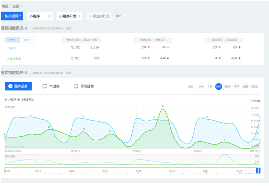这一点,不仅是很多服务商在销售这样的一条龙服务,百度指数也有显示:在小程序相关的搜索词中,“小程序开发”的搜索热度仅次于“小程序”,企业开发小程序以及企业学习开发小程序的需求,非常旺盛。