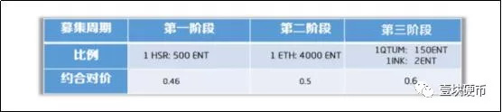 据ENT白皮书资料显示,其募资分为三个阶段,不同阶段有不一样的折扣,每个阶段使用了不同币种募集资金。
